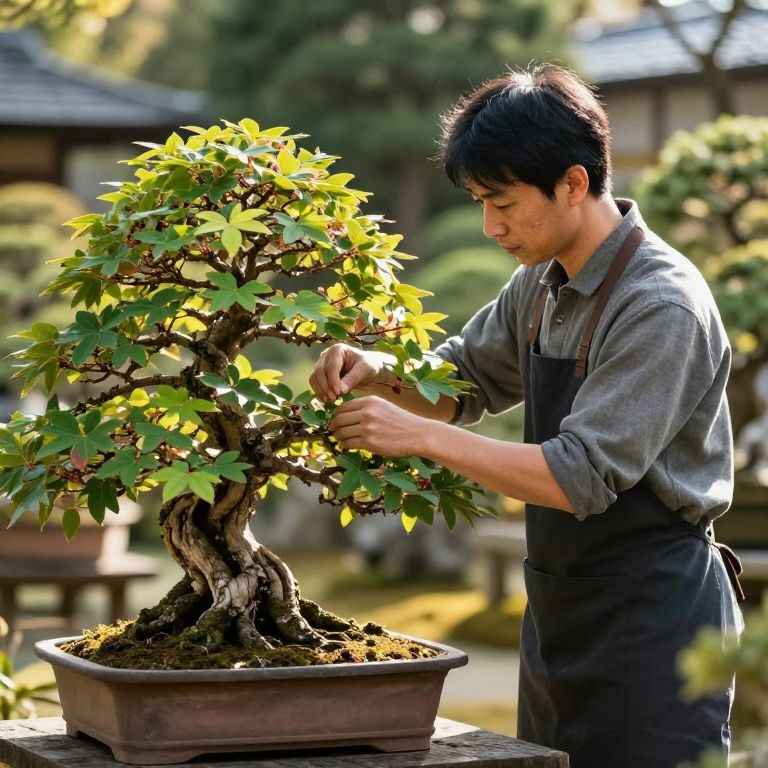 Discipline visualized as a disciplined gardener meticulously pruning bonsai trees in a tranquil Japanese garden, delicate leaves and twisted branches detailed with precision, warm sunlight casting gentle shadows, peaceful yet focused mood evoking patience and care.