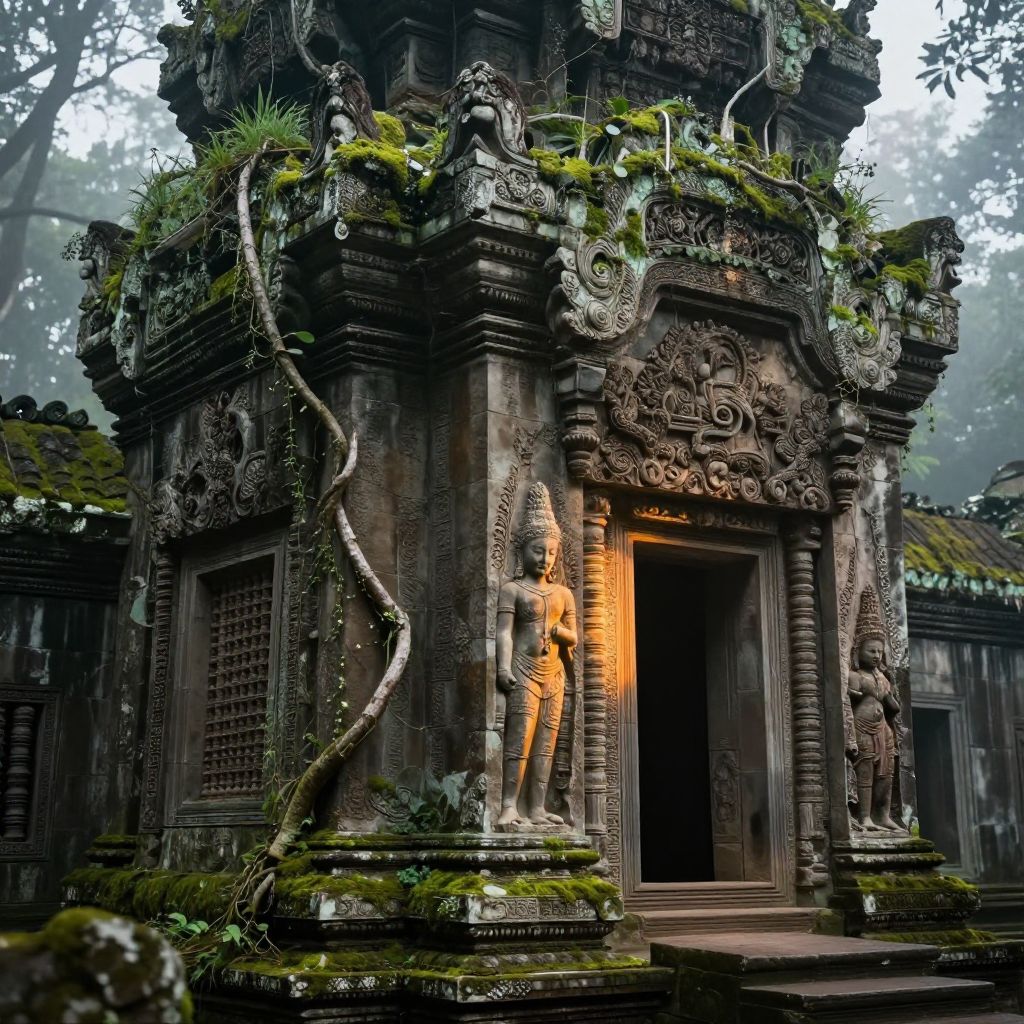 Stable diffusion img2img upscale depiction of an ancient stone temple overgrown with moss and vines, intricate carvings illuminated by warm ambient light, atmospheric fog in the background, highly detailed textures and realistic depth