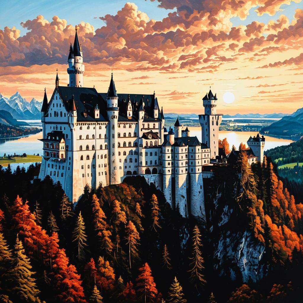Neuschwanstein Castle, oil on canvas, intricate detail, high resolution, magical, warm tones, sunrise