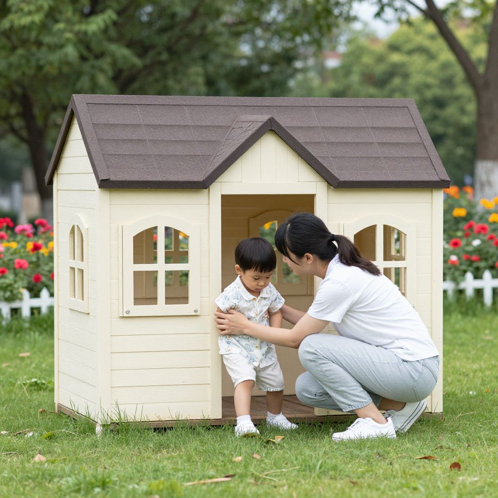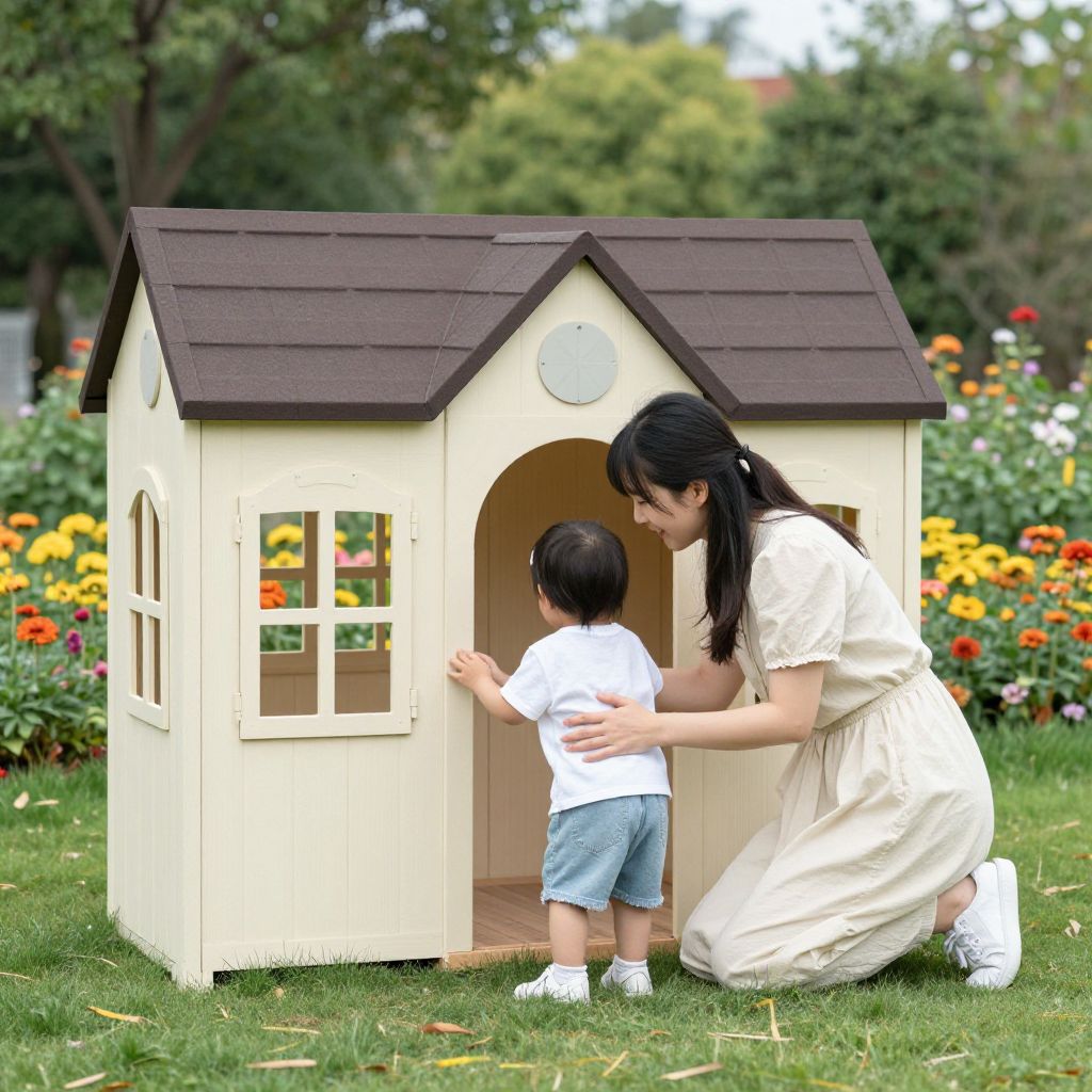 Playful scene unfolds as a woman assists a child inside a charming cream-colored playhouse with a dark brown roof, set amidst a lush green lawn and vibrant flowerbeds.