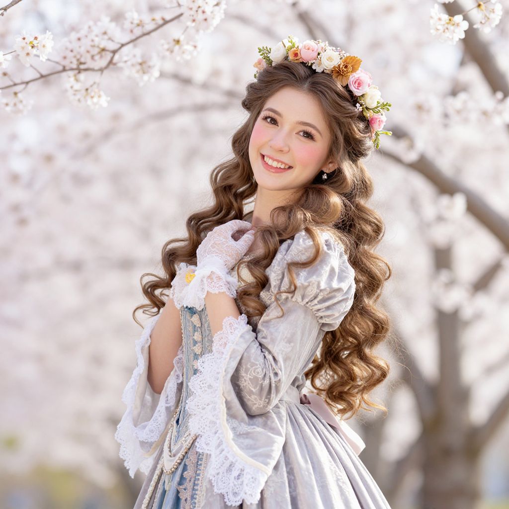A joyful teenage girl with long, voluminous curly hair in a romantic floral crown hairstyle poses under a cherry blossom tree, wearing a Victorian-style costume with lace gloves and a flowing velvet dress, her face glowing with smiles and soft pink cheeks in natural morning light.