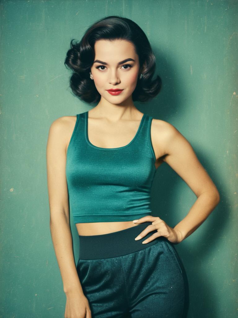 Woman, athleisure, beige sports bra, scoop neck, racerback, cropped below the bust, high-waisted black track pants, loose fit, elastic waistband, neutral studio background. --sref 1387