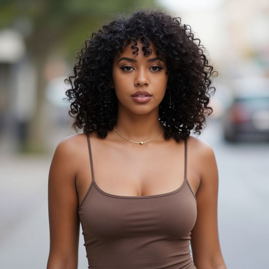 Photograph of a young Black woman with medium brown skin and natural, voluminous, curly black hair. She has a slender build and wears a fitted, brown, spaghetti-strap tank top that accentuates her small to medium-sized breasts. She has full, slightly parted lips and dark, expressive eyes. Around her neck is a delicate gold necklace with a small pendant. The background is a blurred urban street scene with trees and cars, giving a shallow depth of field that keeps the focus on her. The overall mood is confident and poised.