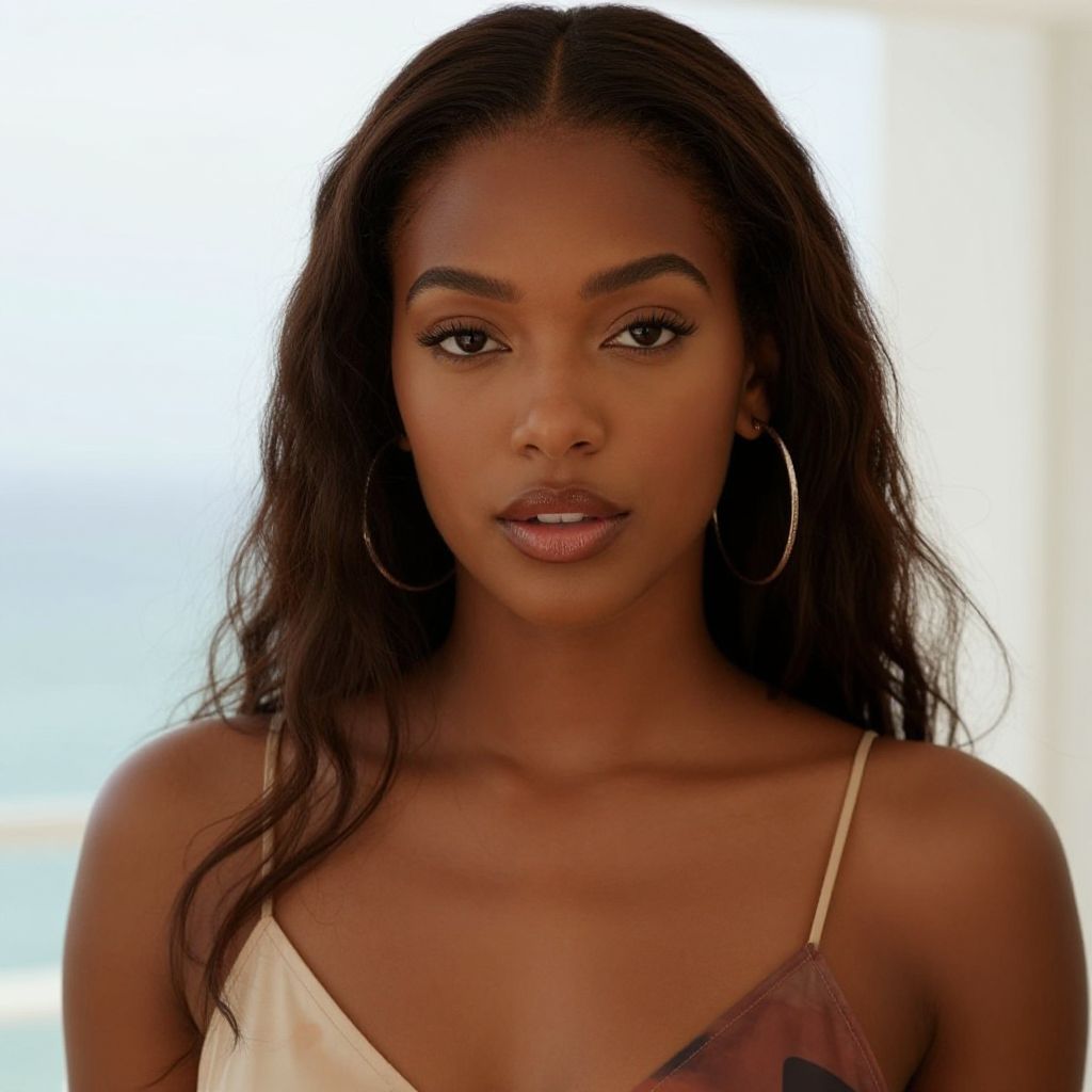 Photograph of a beautiful Black woman with curly hair, wearing a brown tank top and gold necklace, standing on a blurred urban street.