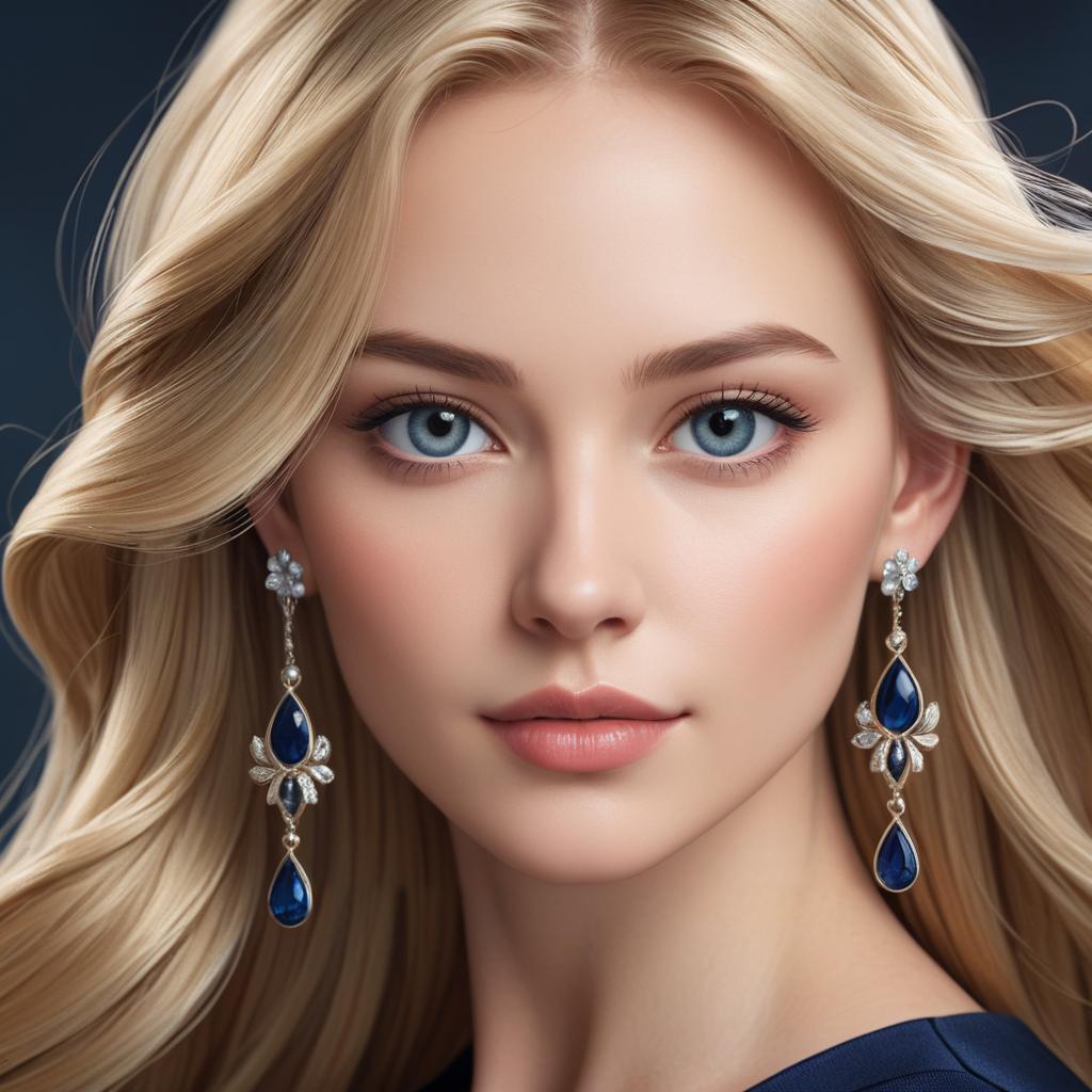 A close-up portrait of a young woman with long flowing blonde hair and striking blue eyes, wearing elegant silver earrings and a dark navy blue textured top, soft natural lighting highlighting her smooth skin and subtle makeup, photorealistic quality with detailed hair strands and natural facial features, neutral background with warm tones enhancing her complexion