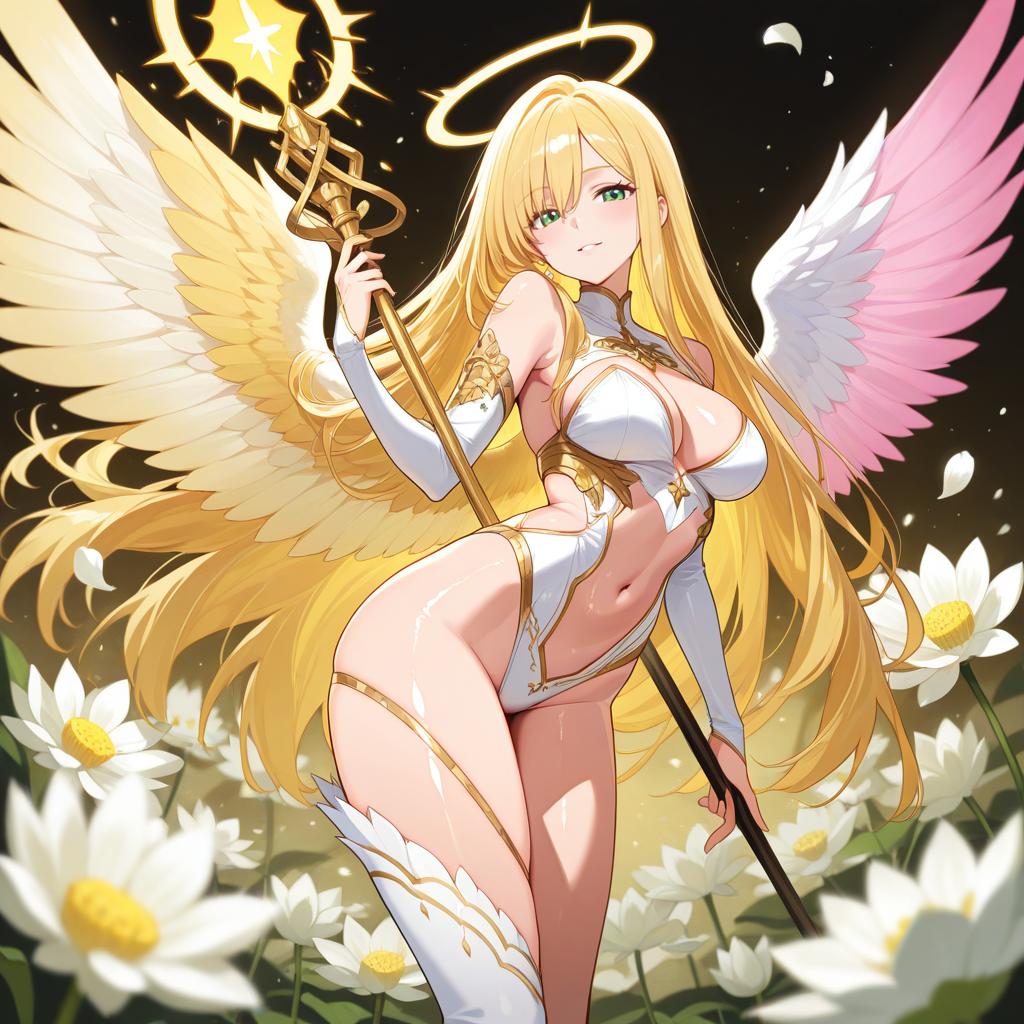 Digital anime-style illustration of a cheerful young woman with very long blonde hair and a halo above her head, wearing a white collared shirt with a blue bow, pleated navy skirt, black knee-high socks, and blue wrist scrunchies. She is posing with a peace sign and a wave in an outdoor park setting with city buildings in the background.