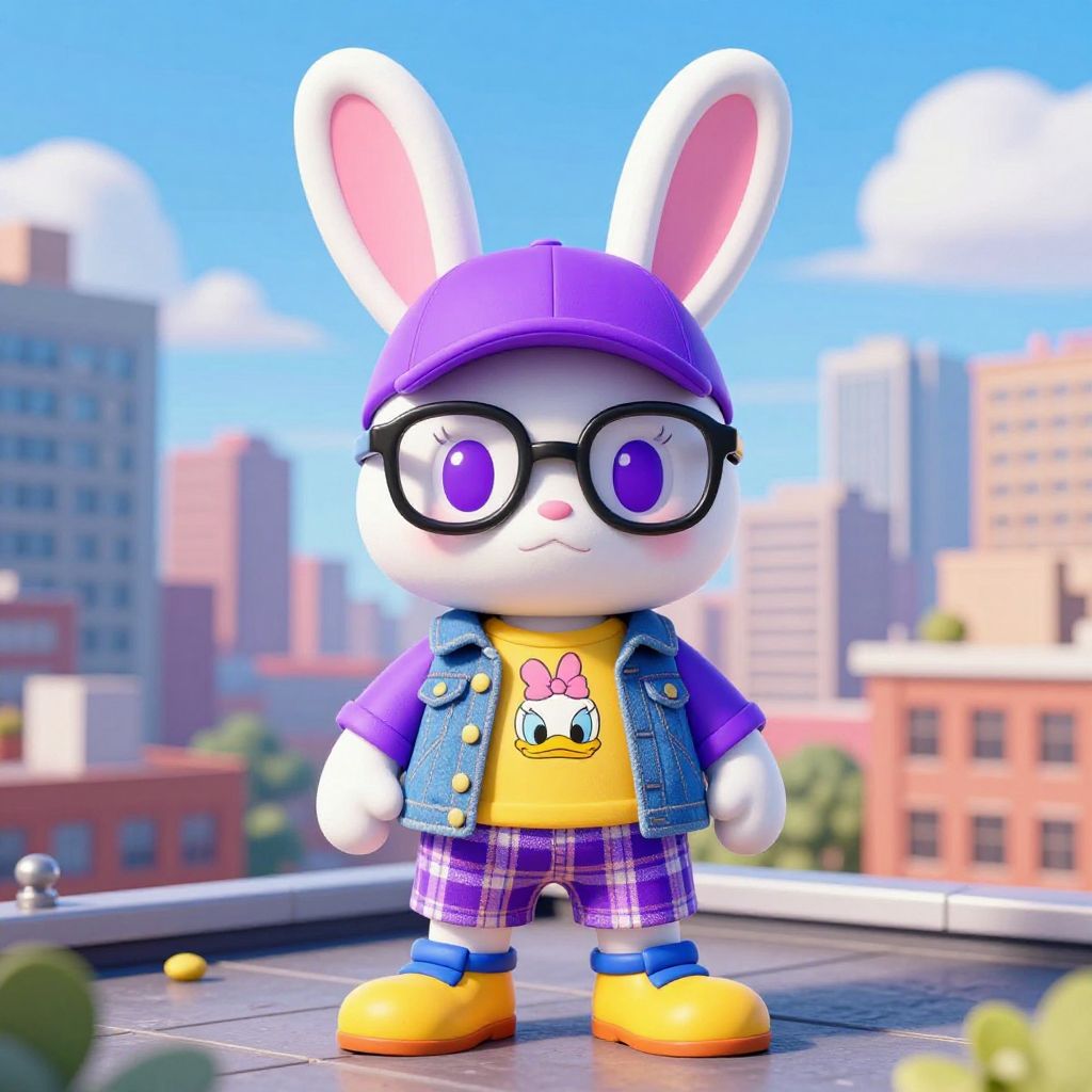 Anthropomorphic white rabbit character with large pink ears and purple eyes, wearing black glasses, a purple cap, a yellow t-shirt featuring a Daisy Duck design, a denim jacket with purple sleeves, plaid shorts, and yellow shoes with blue straps standing confidently on a city rooftop. The background showcases a vibrant urban skyline with tall buildings under a clear blue sky with fluffy clouds.