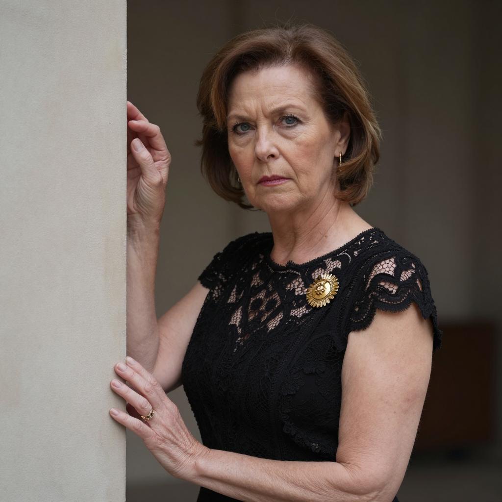 Woman with short blonde hair, wearing a blue shirt and dark vest, stands behind a wooden table with a green sign reading "TRADE TICKET FOR PRESIDENT! SIGN UP FOR CONTEST!". Glass jar filled with white tickets on table. Brick column on left, wooden benches and fluorescent lights in background. Blue and yellow patterned bag on floor to the left. Woman's hands are clasped in front of her.