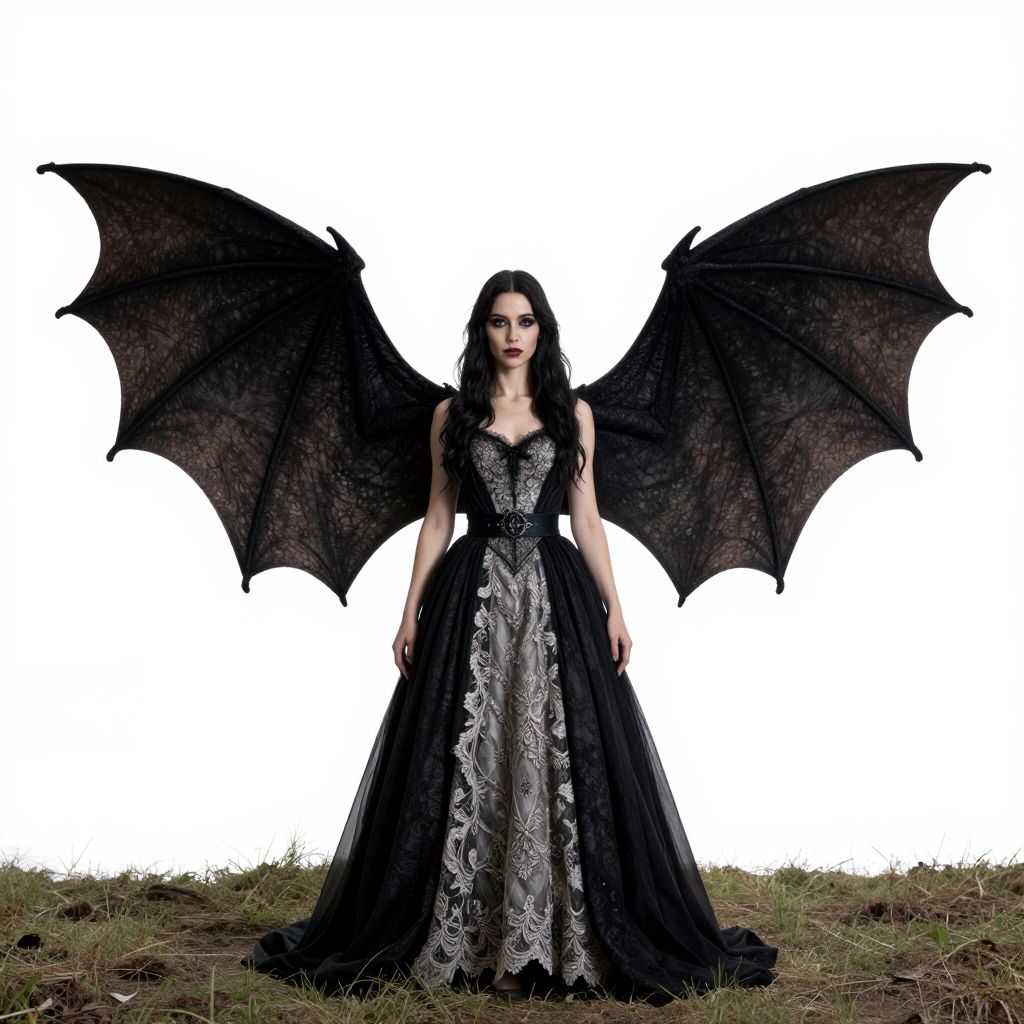 Elegant gothic fairy stands gracefully, her flowing gown adorned with intricate lace details and a dark belt, as her expansive bat-like wings spread wide against a stark white background, set upon a patch of grassy earth.