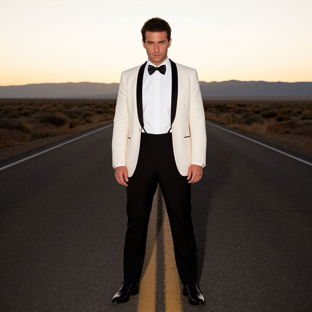 A man, ivory dinner jacket, crisp white dress shirt, black dress suspenders, black satin bow tie, black dress trousers, shiny black oxford shoes, sunset glow, endless asphalt, distant mountains, medium format film, confident expression. Man has masculine face and piercing eyes