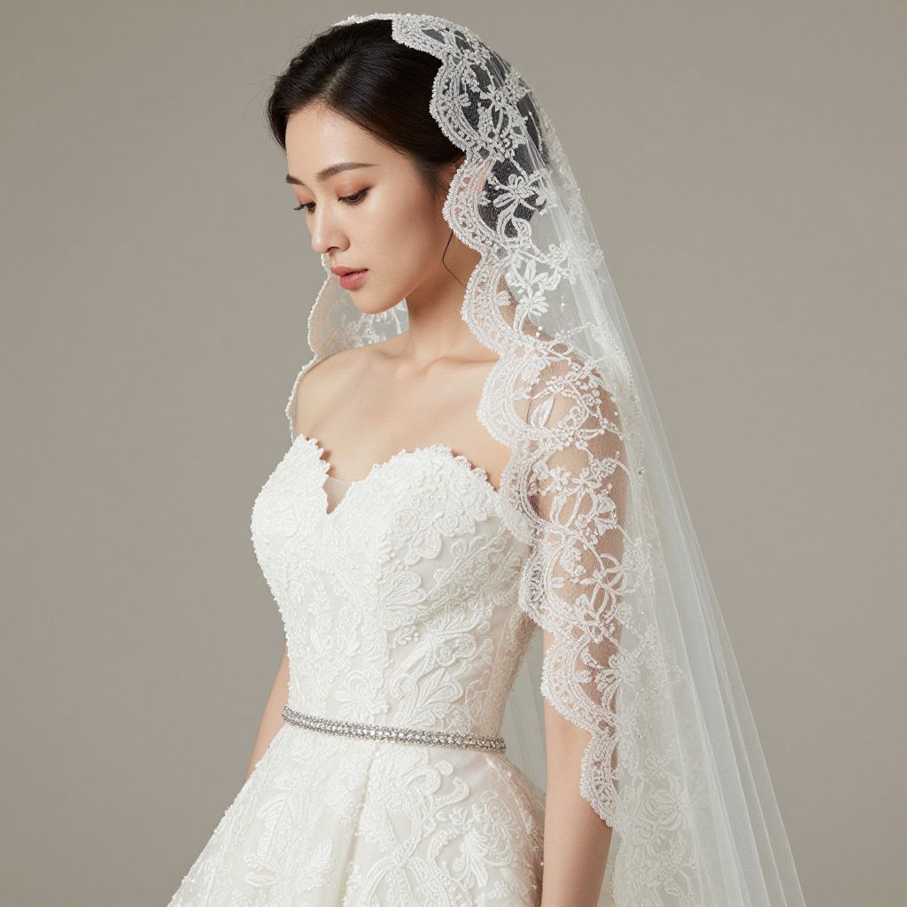 Elegant bridal portrait showcasing a woman wearing a delicate lace and beaded bridal veil cascading gracefully over her shoulder, complemented by a stunning white wedding dress featuring intricate floral embroidery and a shimmering waistband, set against a soft neutral backdrop.
