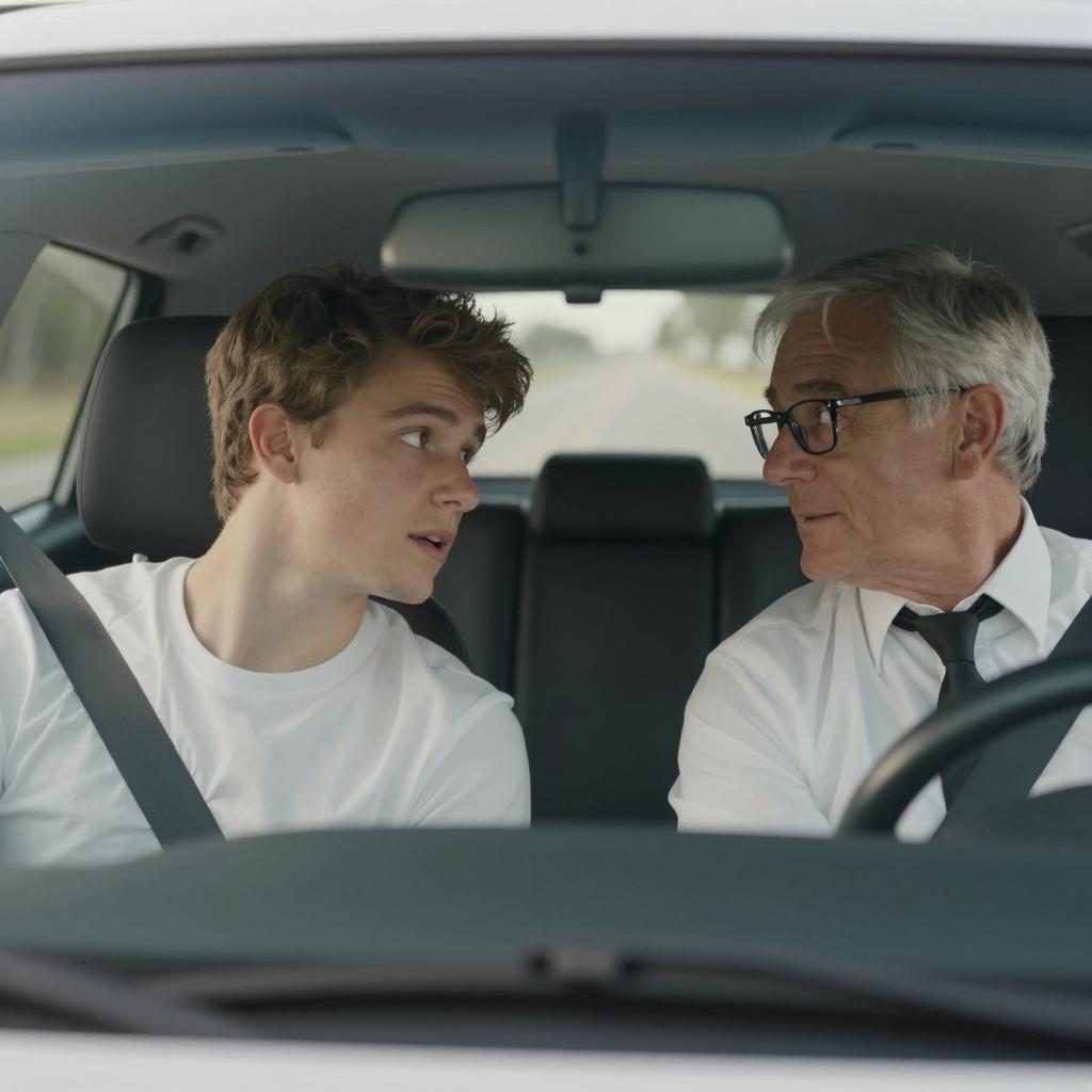 A car interior. A male police officer in a dark gray uniform with a badge points at a young man with curly brown hair, wearing a worn green jacket. The officer is seated on the left, the young man is seated on the right. The car's ceiling has a mesh cover. Sunlight streams through the window on the left. The background shows a cityscape outside the window.