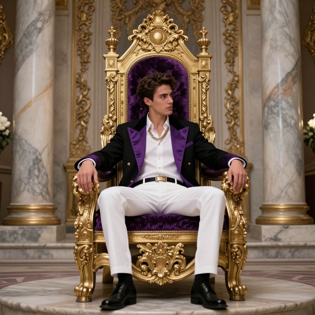 In this stunning full-body wide photo, an elegantly dressed young man sits regally on a grand throne, exuding an air of sophistication and contemplation. The throne, adorned with intricate gold accents and purple velvet, is positioned against a backdrop of marble columns and ornate carvings, evoking a sense of opulence and historical grandeur. The man's attire, a combination of a white shirt, black jacket with purple accents, and white pants, is complemented by a gold chain necklace, adding to his distinguished appearance. The lighting is soft yet dramatic, with a moody, cinematic quality that enhances the luxurious and decadent atmosphere. The background is softly blurred, creating a bokeh effect that draws the viewer's attention to the subject. The overall composition is dynamic, with the man's posture and the throne's ornate details creating a harmonious balance between the subject and the surroundings. The image is a masterful blend of hyper-realistic detail, intricate textures, and vibrant colors, capturing the essence of a lavish, Oscar Wilde-inspired fashion editorial.