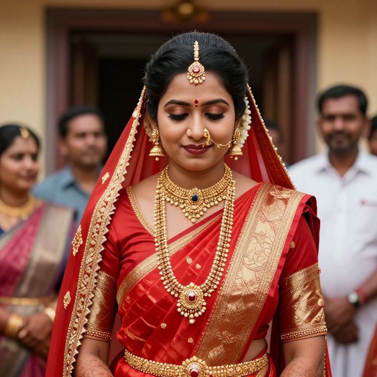 A detailed close-up of a bride in elaborate bridal customs attire from South India, wearing a bright red sari with gold borders, intricate footwork patterns, and a jeweled neckpiece, her face serene and deeply expressive as she stands in front of a temple doorway during a community wedding ritual
