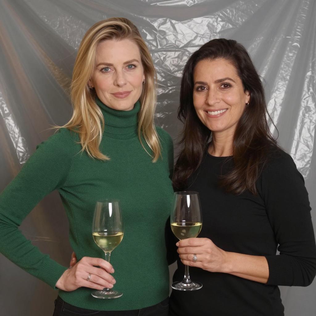 Two women standing in front of a plastic sheet backdrop. Woman on left, blonde, green turtleneck, holding wine glass, hand on hip. Woman on right, dark brown hair, black long-sleeve top, holding wine glass, smiling. Both have light skin, standing closely together, facing camera.
