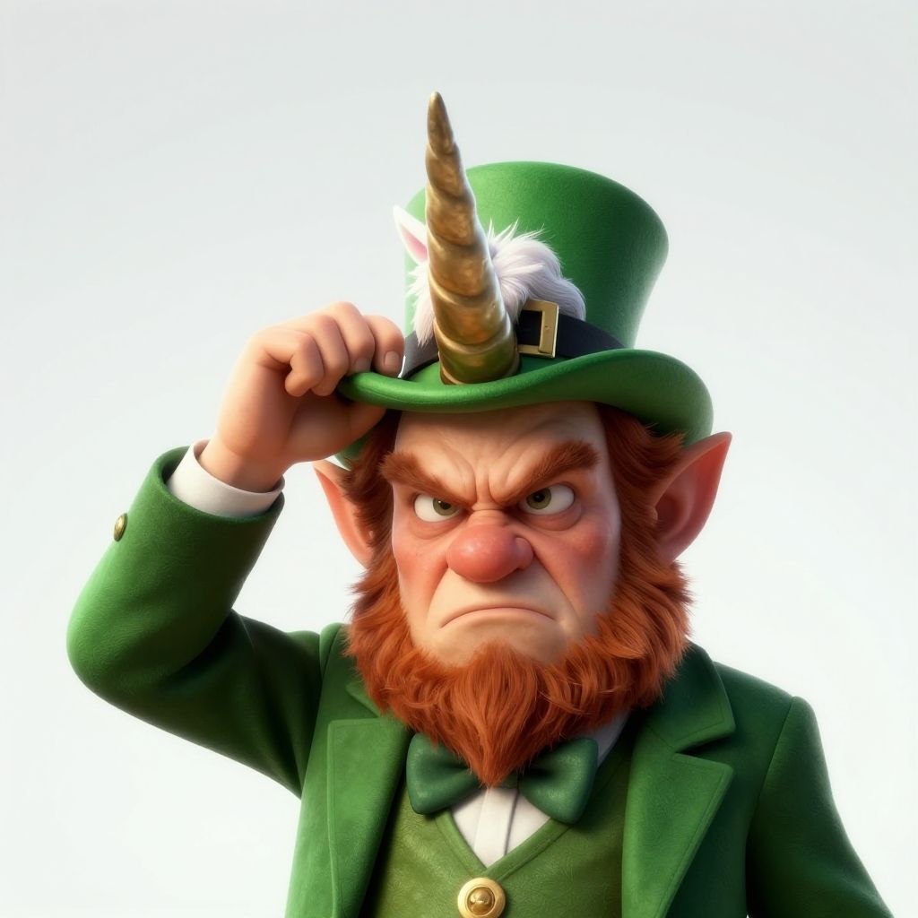 Absurd res, 8k, high quality, best quality, masterpiece, volumetric lighting, photorealistic, realistic, detailed eyes, extremally detailed face, a angry leprechaun in a green suit tugging on a unicorn horn growing on his forehead, pulling on horn
