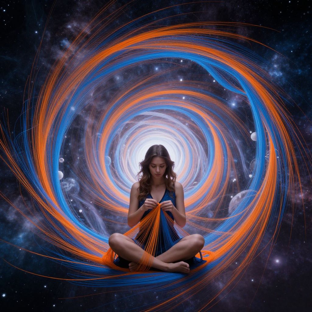 A woman sits cross-legged beneath a swirling cosmic vortex, weaving a vibrant tapestry of orange and blue threads that seem to emanate directly from the celestial fabric of the universe.