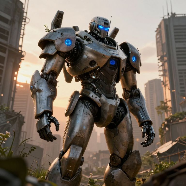 CGI image of a futuristic, metallic robot with blue glowing eyes standing in a ruined, overgrown cityscape at sunset.