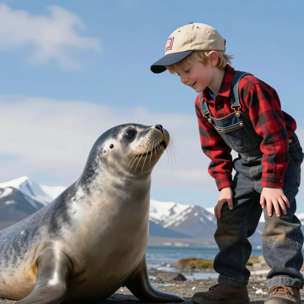 A young boy and a seal. The boy wears a red checkered shirt, dark overalls, and a backward baseball cap. The seal raises its head towards him. They are outdoors with a blue sky, white clouds, and snow-capped mountains in the background. The boy smiles, while the seal looks up at him. Both are positioned on the right side, with the seal's body on the left. The boy leans slightly forward.