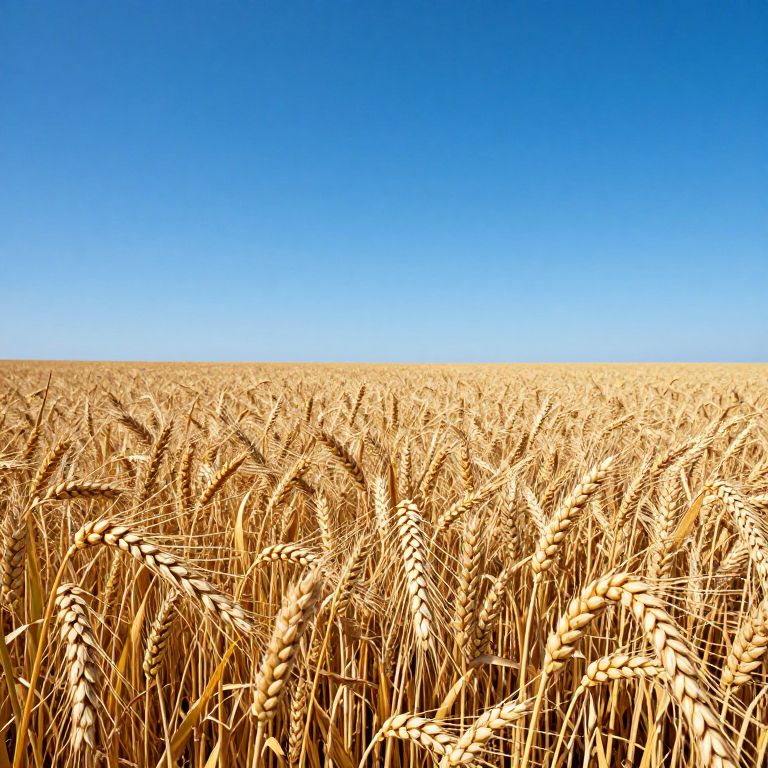 Photograph of a vast golden wheat field under a clear, bright blue sky. The wheat stalks, with their plump, tan heads, fill the entire foreground, creating a dense, textured carpet. The horizon is barely visible, blending seamlessly with the sky, emphasizing the expansive nature of the field. The sunlight casts a warm glow, highlighting the wheat's texture and details. The image conveys a sense of abundance and tranquility, typical of a sunny, late summer or early autumn day.