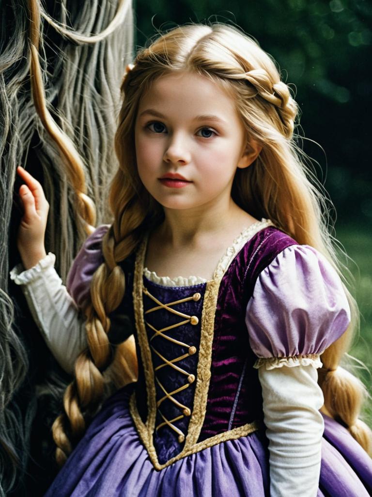 Child in Rapunzel Costume, cinematic realism, magical whimsical portrait