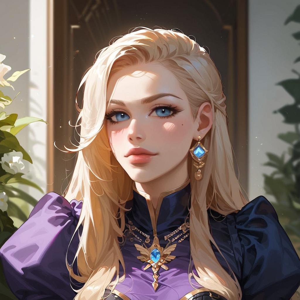 Score_9, score_8_up, score_7_up, , source_real, raw, photo, amateur, realism, 35mm photo, flash photo, highly detailed, portrait, face photo, detailed skin, depth of field, detailed face, colorful, vivid colors, volumetric lighting, detailed eyes, purple dress, puffy sleeves, very long hair, blonde hair, blue eyes