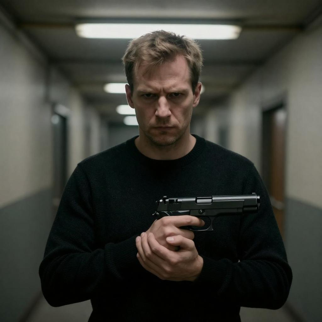 Photograph of a serious-looking man with short, light brown hair, wearing a black sweater, holding a black handgun in a tense, dimly lit, industrial hallway with fluorescent lights and metal ceilings. His focused expression contrasts with the gritty, urban background.