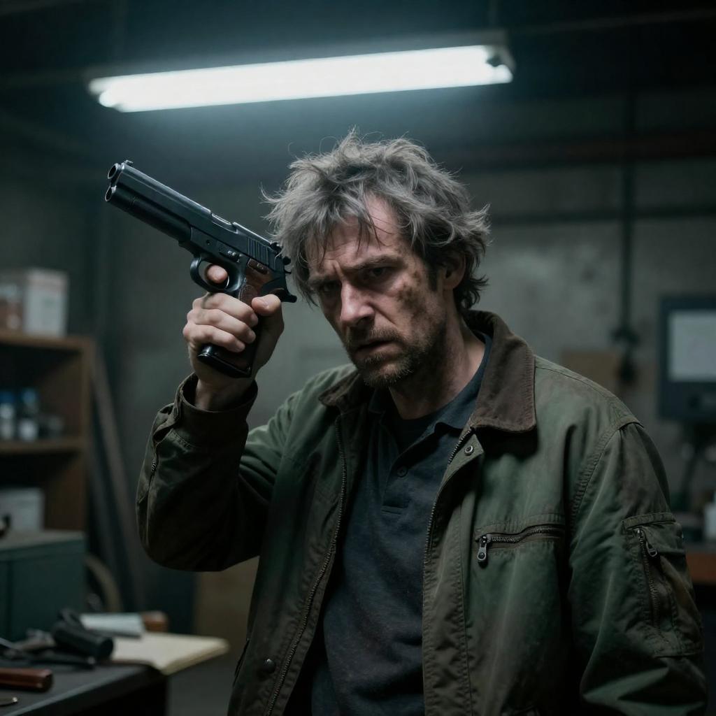 Serious Man Holding Gun in Industrial Hallway