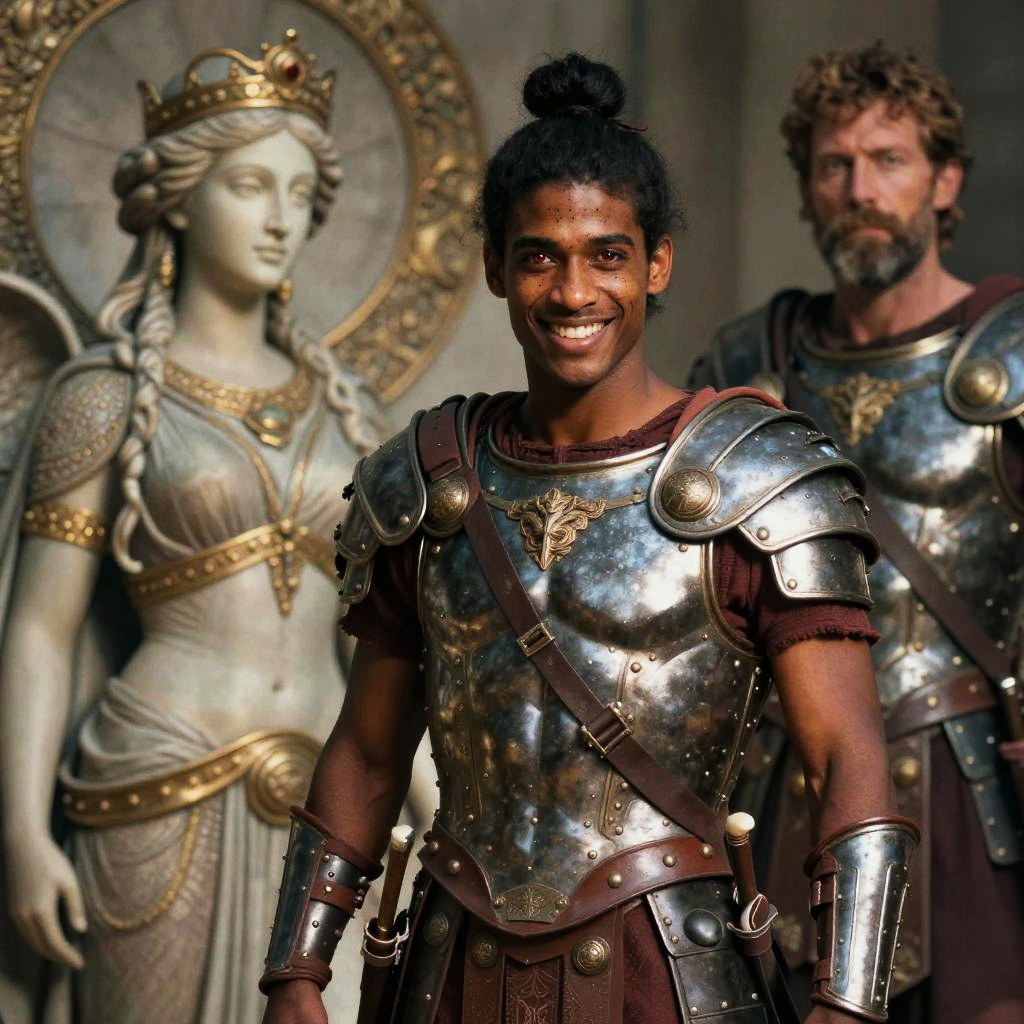 (masterpiece, best quality, ultra-detailed, best shadow), (western style:0.5), (realistic:1.2), analog style, (fibonacci), (detailed background, upper body, cowboy shot, smiling, standing, looking at viewer, facing viewer), (detailed face, masculine features, mature face), (best illumination), ((cinematic light)), colorful, hyper detail, dramatic light, intricate details, (1boy [androgynous], (man) named Fyroris, black hair, (dark-skinned male), (hair bun, tied hair), (black sclera:1.5, red eyes), roman armor, medieval, goddess)