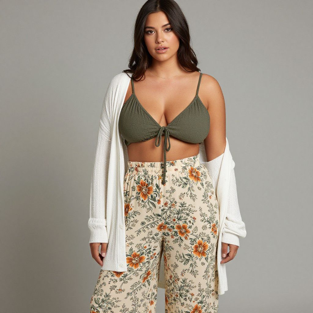 "Woman, casual bohemian, olive green crop top with thin straps, knotted front detail, low scoop neckline, paired with high-waisted palazzo pants in cream with a floral pattern in shades of orange and green, comfortable fit, loose and flowing leg cut, white long-sleeve cardigan, unbuttoned, relaxed fit, white low-top canvas. Sexy. Pretty face and beаutiful eyes. Big breasts."