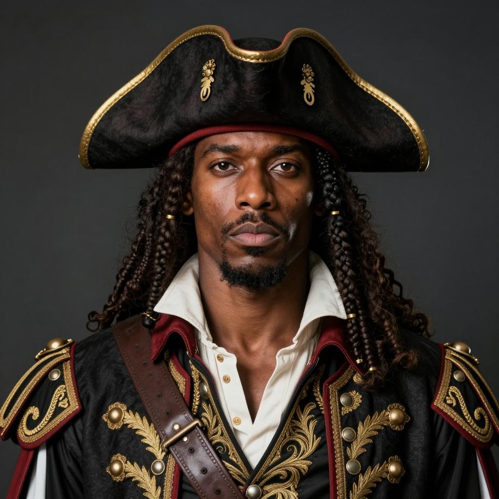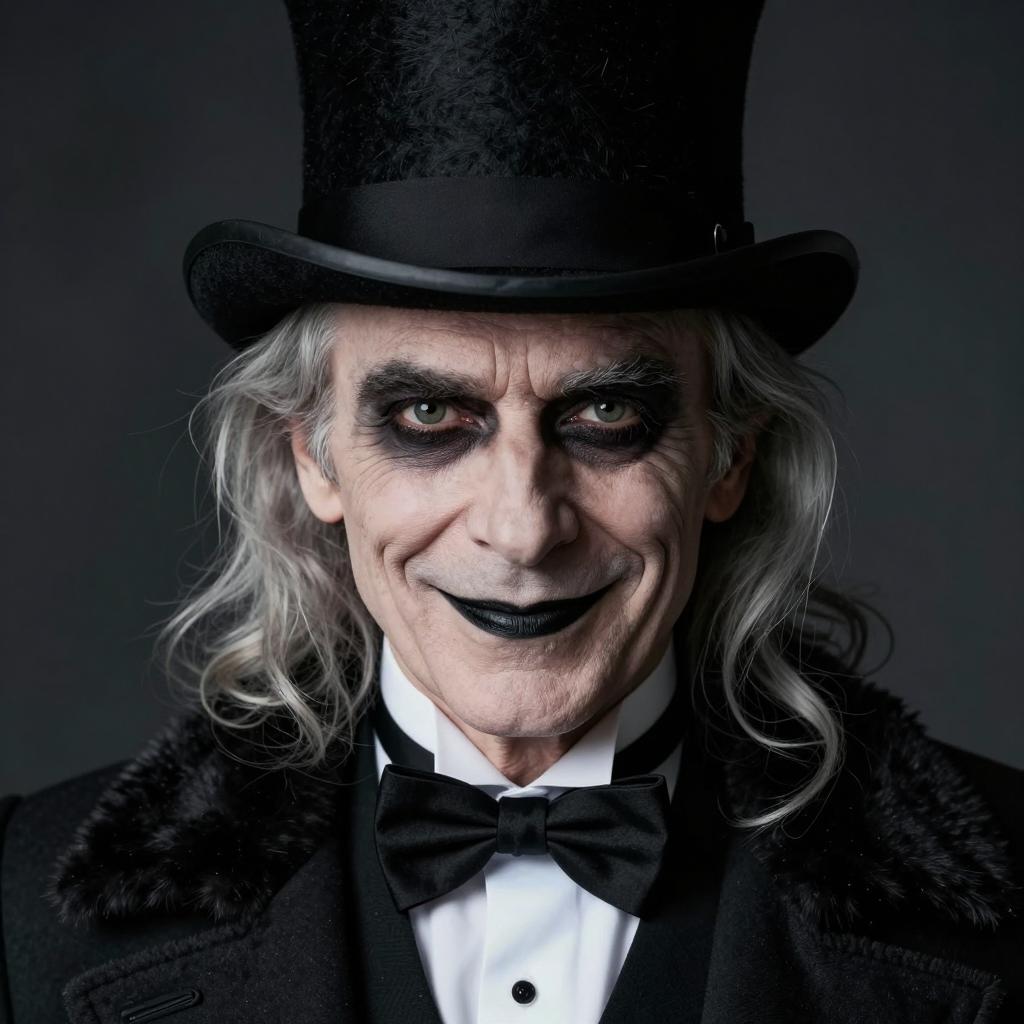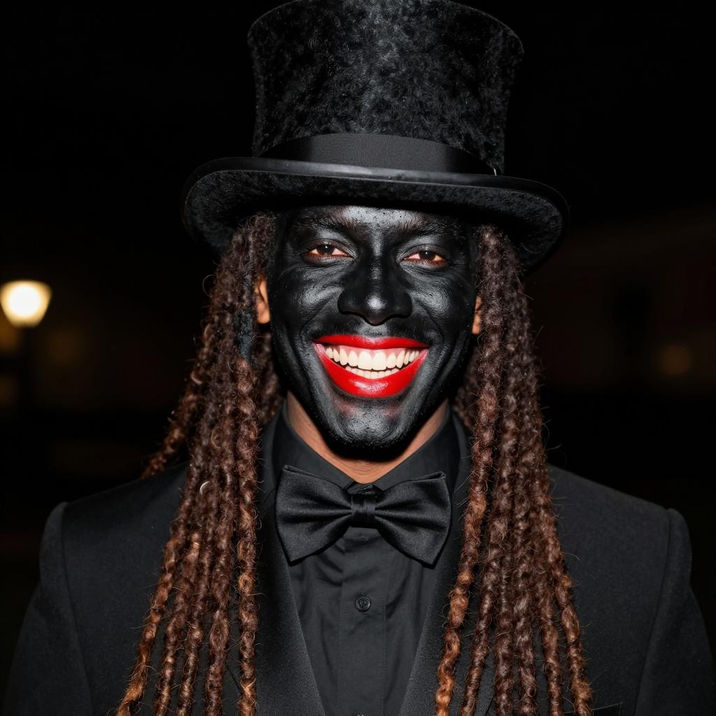 A person with dark skin, black face paint, and long brown dreadlocks. They wear a black top hat, black bow tie, and black suit jacket. Bright red lipstick contrasts with their face paint. Background is dark and blurred. Person is smiling widely, showing teeth. Nighttime setting.