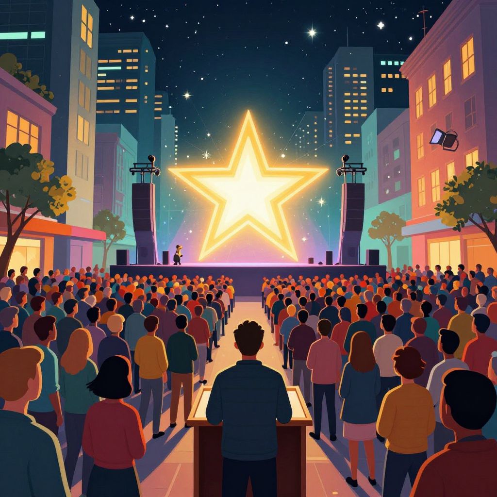 This digital illustration depicts a nighttime outdoor concert in a city square. A large, glowing yellow star is the focal point on a brightly lit stage, surrounded by tall buildings with illuminated windows. A diverse crowd of people, dressed in casual attire, stands in the foreground, facing the stage. The sky is dark with stars, and trees are visible on either side. Stage speakers and a microphone stand are positioned on either side of the glowing star. The vibrant colors and clean lines give the image a modern, animated style.