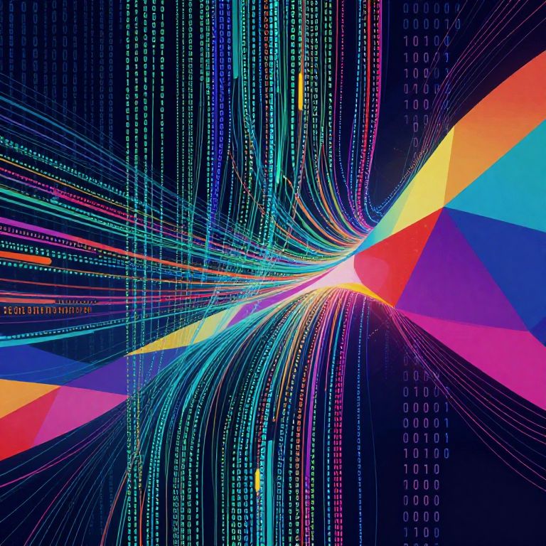 Logiciel abstract visualization, flowing streams of binary code merging into colorful geometric shapes, representing software algorithms and digital processes, high resolution, vibrant palette, modern tech inspired graphic art