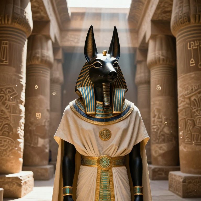 Egyptian jackal mask worn by a mysterious figure in ceremonial robes, standing in an ancient temple hall with towering columns, illuminated by shafts of sunlight filtering through cracks, mystic symbols floating subtly in the air