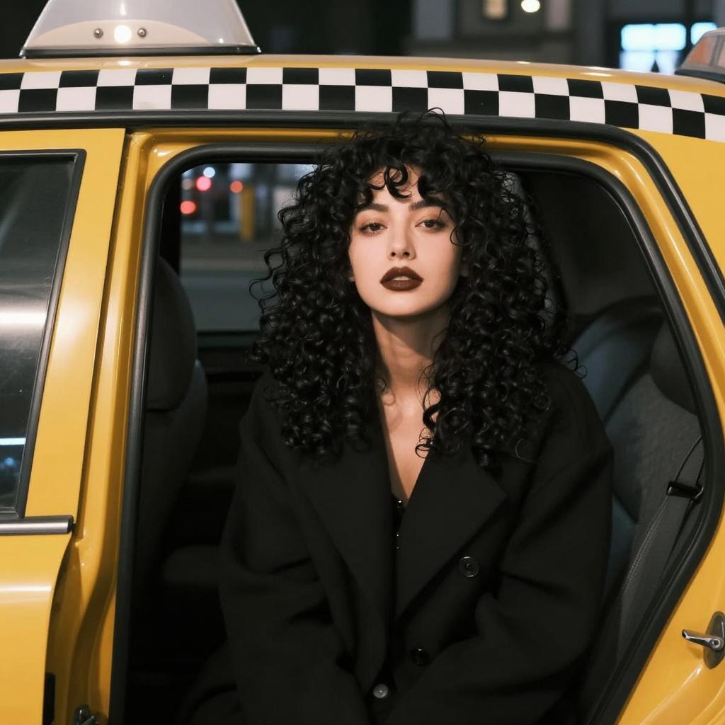Photograph of a woman with voluminous black curly hair, dark lipstick, and a black coat, seated in the back of a yellow taxi with a black and white checkered roof. Background is a dimly lit urban night scene with blurred lights and buildings. She has a neutral, slightly introspective expression.