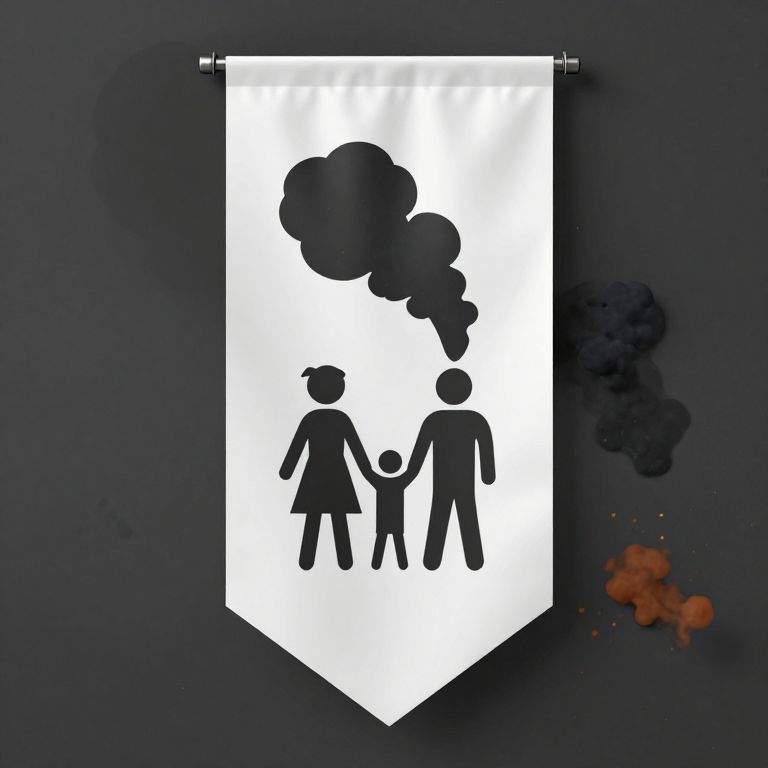 Black-and-white banner with simplified family silhouettes holding hands, above smoke clouds, hanging on dark blue background with ink splatters.