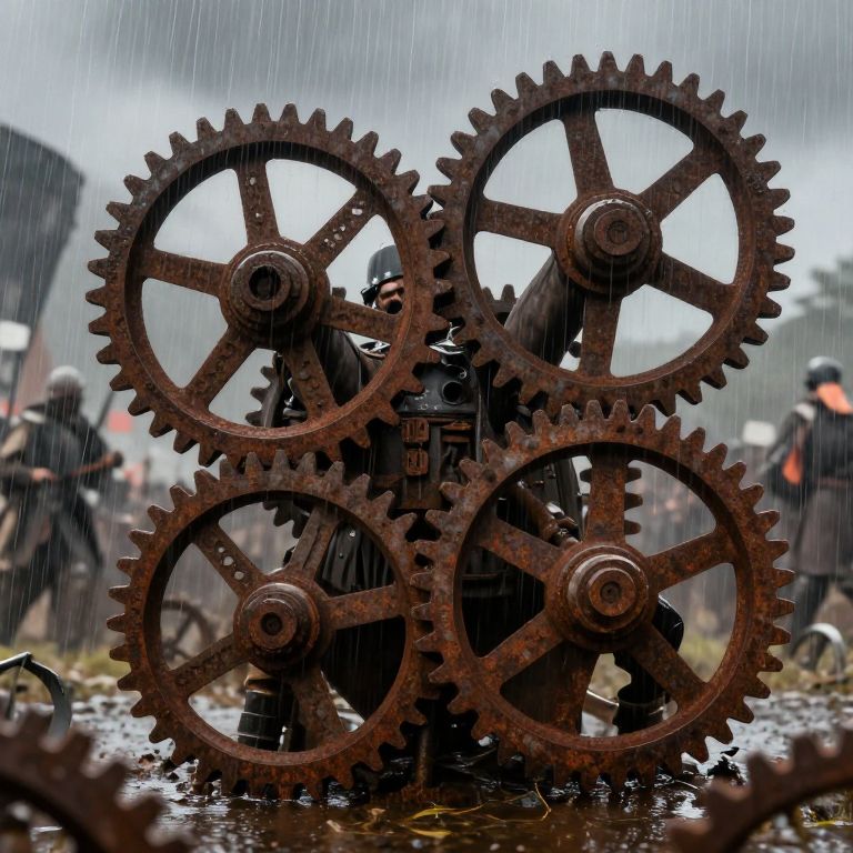 Photograph of large, rusted, interlocking gears in the rain, with blurred, rain-soaked soldiers in the background, creating a steamp