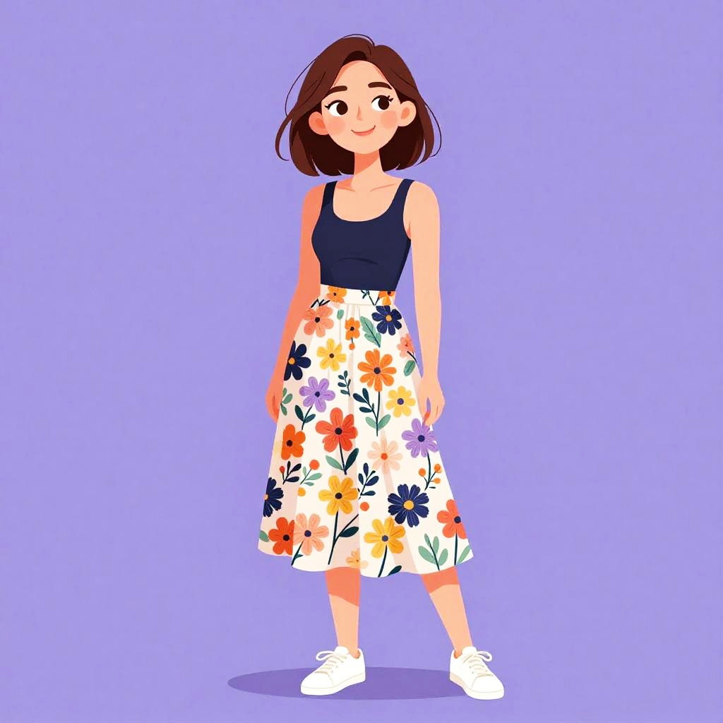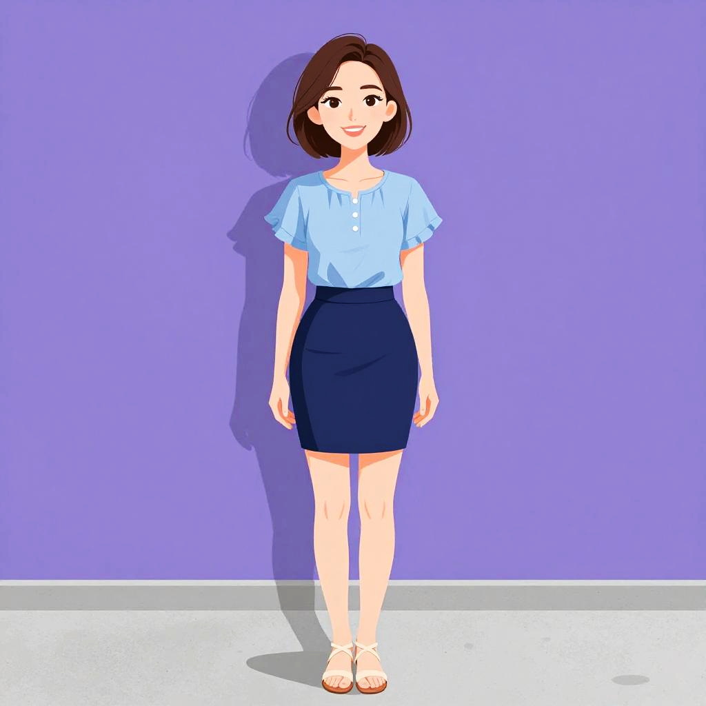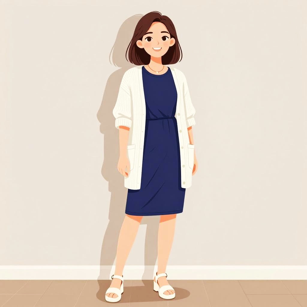 Woman with pretty face and pretty hair. smiling Woman, casual chic, navy blue T-shirt dress, short rolled-up sleeves, relaxed fit, ribbed white open-front cardigan with long sleeves, mid-thigh length, minimal jewelry with a thin necklace, white platform sandals with ankle straps, simple and natural hairstyle, neutral indoor setting with a plain light background --sref 1467