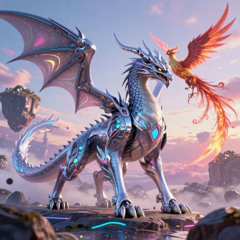 Cool fantasy animals depicted as majestic creatures with sleek metallic scales and neon accents, set in a surreal alien landscape with floating rocks and colorful sky, combining elements of dragon and phoenix with futuristic design, dynamic and powerful composition