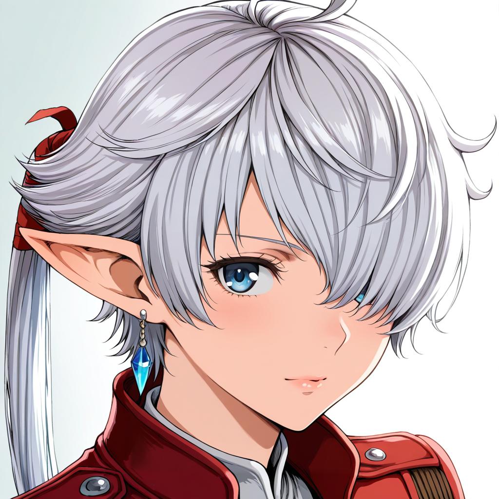 Detailed digital artwork of an anime-style elf girl inspired by Alisaie Leveilleur from Final Fantasy. The character features long white hair with an ahoge, partially covering one blue eye, and tied in a ponytail with a red ribbon. She has pointed elven ears, wears a red jacket with silver buttons, and a blue crystal earring. The style is highly polished with soft shading and fine linework.