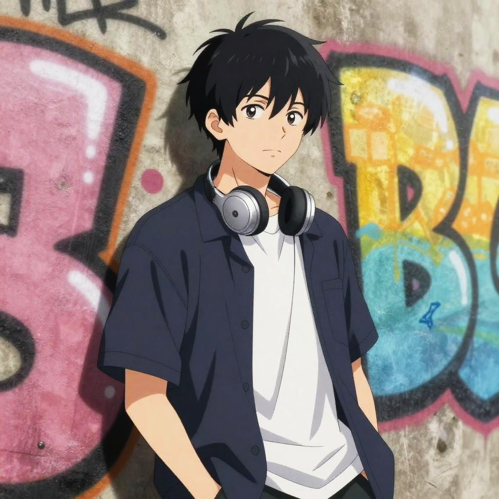Anime guy short hair wearing casual streetwear, headphones around neck, leaning against graffiti-covered wall, urban setting with vibrant colors, candid expression, detailed fabric textures, lively and youthful atmosphere with a touch of rebellion