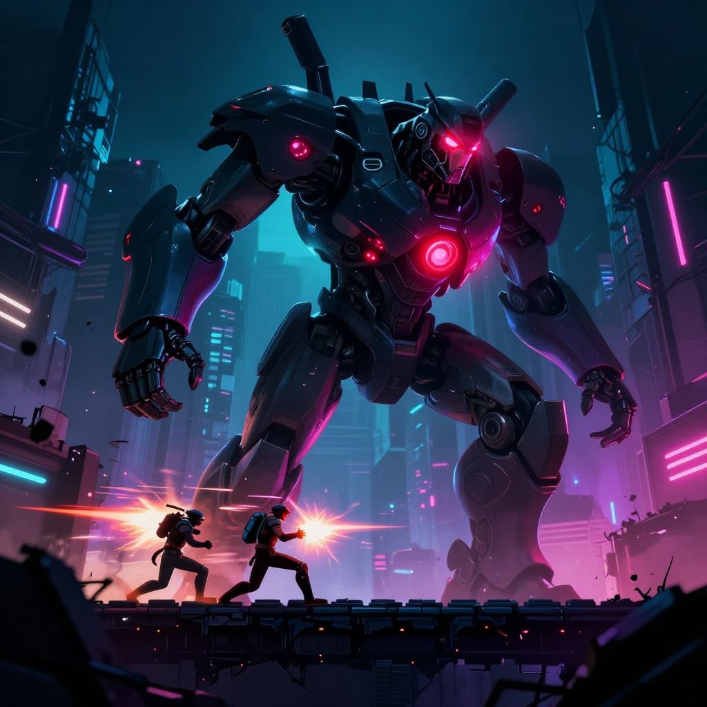 Cyberpunk side scroller boss fight, towering mech with glowing red eyes, neon-soaked urban ruins, fast-paced action with energy blasts, dark moody atmosphere, vibrant cybernetic details