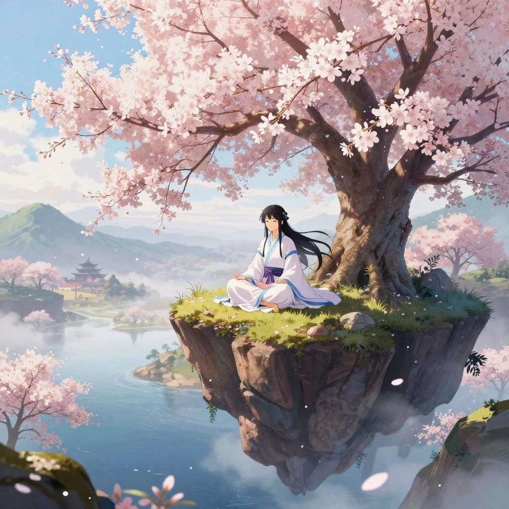 Anime AI art generator illustrating a serene fantasy landscape with cherry blossom trees in full bloom, a mystical anime character meditating on a floating island, soft pastel colors, intricate details, magical atmosphere, high-resolution digital painting