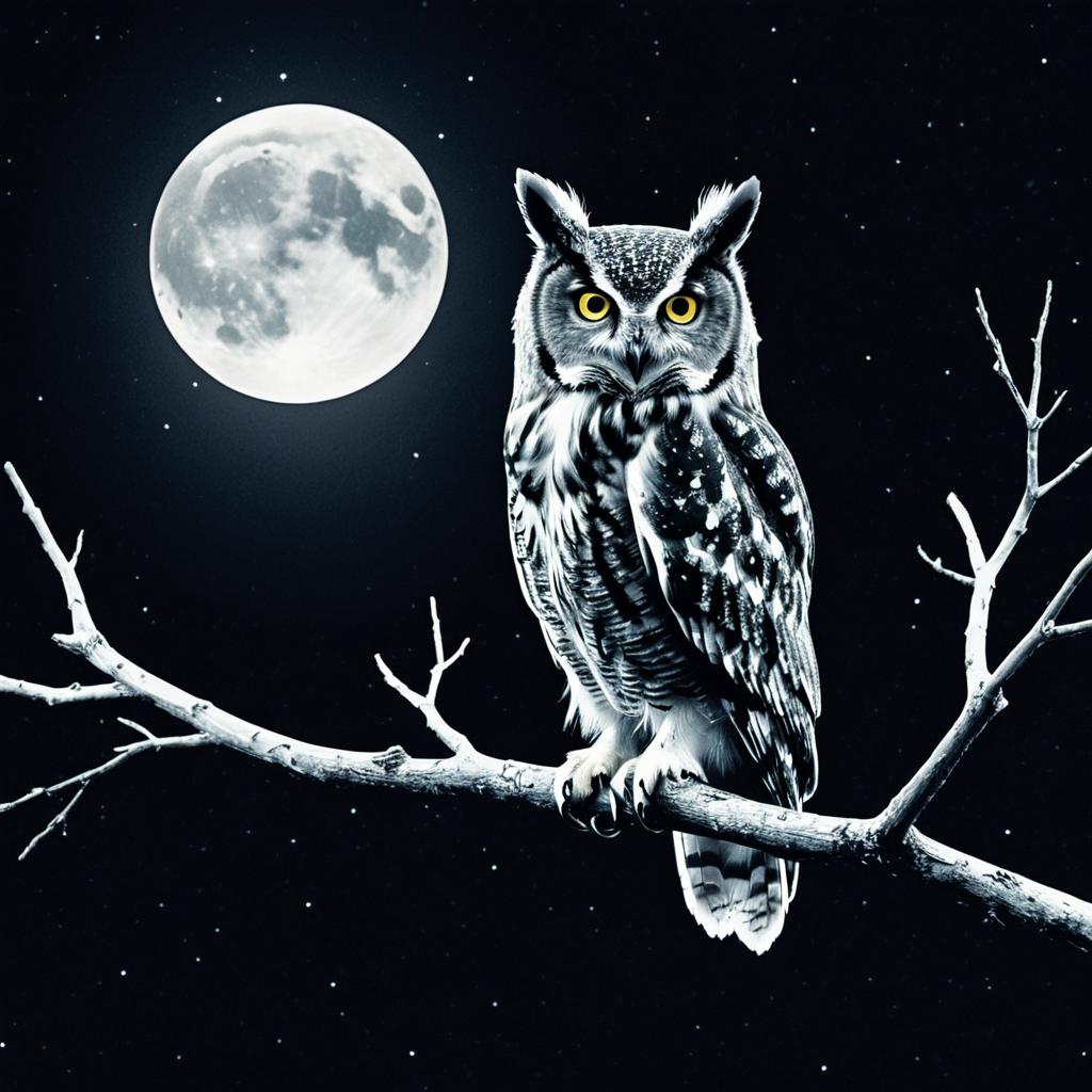 X-ray style digital artwork of an owl perched on a bare tree branch under a bright full moon and starry night sky with faint clouds. The image highlights the owl's fine bone structures and luminous textures in monochrome tones.