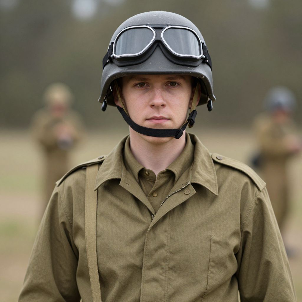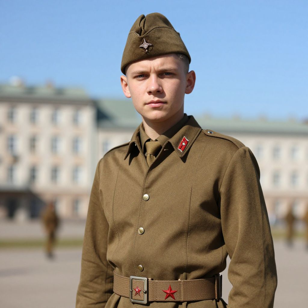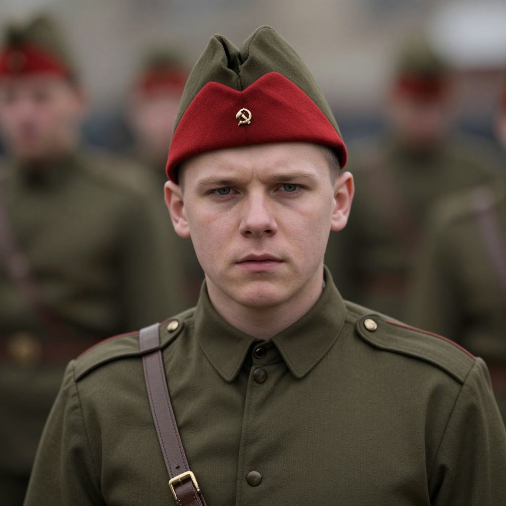 Russian soldier costume, male focus, 1boy, hat, solo, uniform, military uniform, realistic, military hat, military, jacket, world war ii, belt, upper body, buttons, red star, soviet, breast pocket, looking at viewer, brown jacket, pocket, closed mouth, blurry, military jacket, peaked cap, long sleeves, blurry background