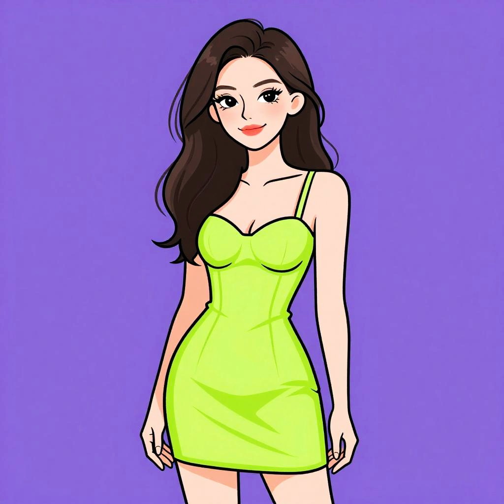 Digital drawing of a fair-skinned woman with long, wavy black hair, standing against a solid purple background. She wears a bright neon yellow, form-fitting, spaghetti-strap dress that accentuates her curves and highlights her medium-sized breasts. Her expression is neutral with a slight smile, and she has pink blush on her cheeks. The style is cartoon-like with bold black outlines and flat colors, emphasizing a modern, vibrant aesthetic. The woman's pose is relaxed, with her arms hanging naturally by her sides.