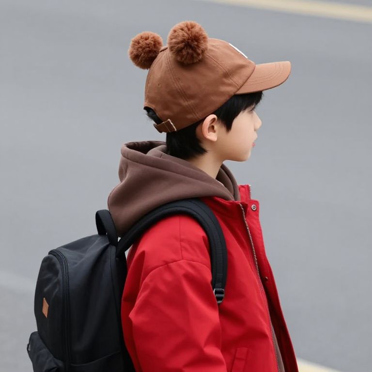 A young boy is wearing an orange outfit with a hoodie and a pair of orange ears. He is standing on a street with other people in the background.