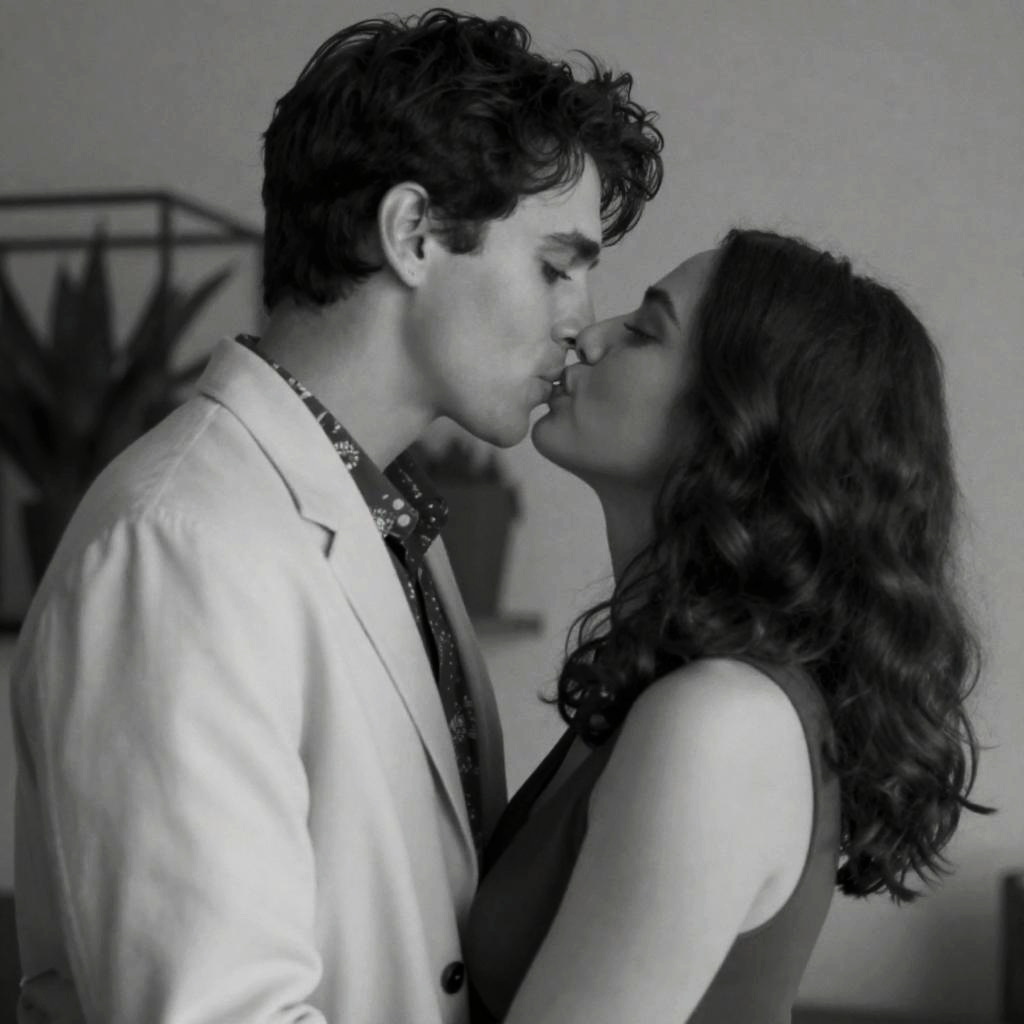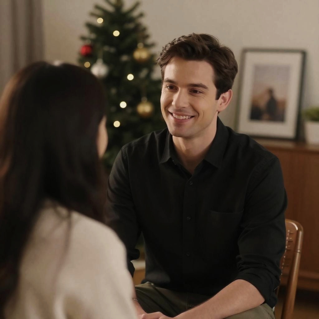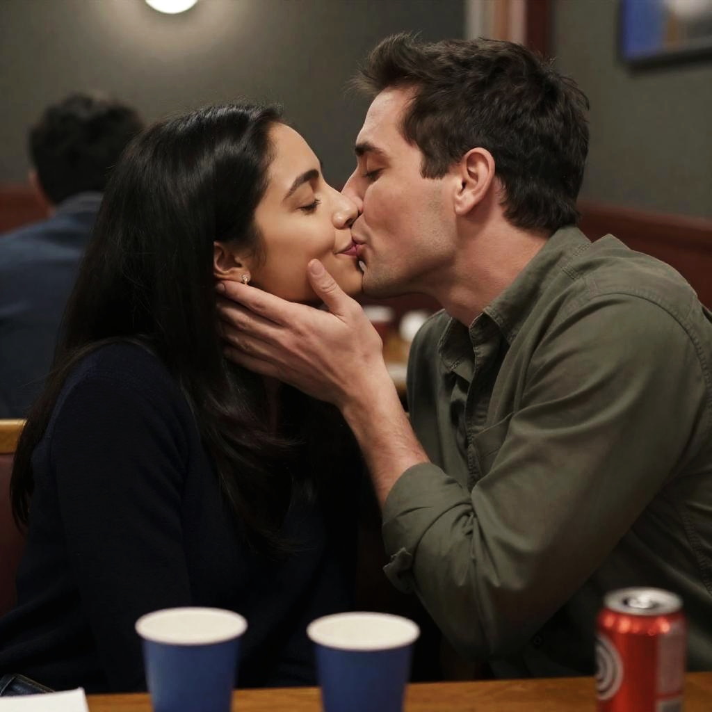 Photograph of a couple kissing. Woman with dark hair in a sleeveless dress, man with dark hair in a black shirt. Warm, dimly lit background with red ornaments, white Christmas tree, and hanging lights. Man's left hand on woman's waist. Both eyes closed, intense expressions. Two other people partially visible on left.