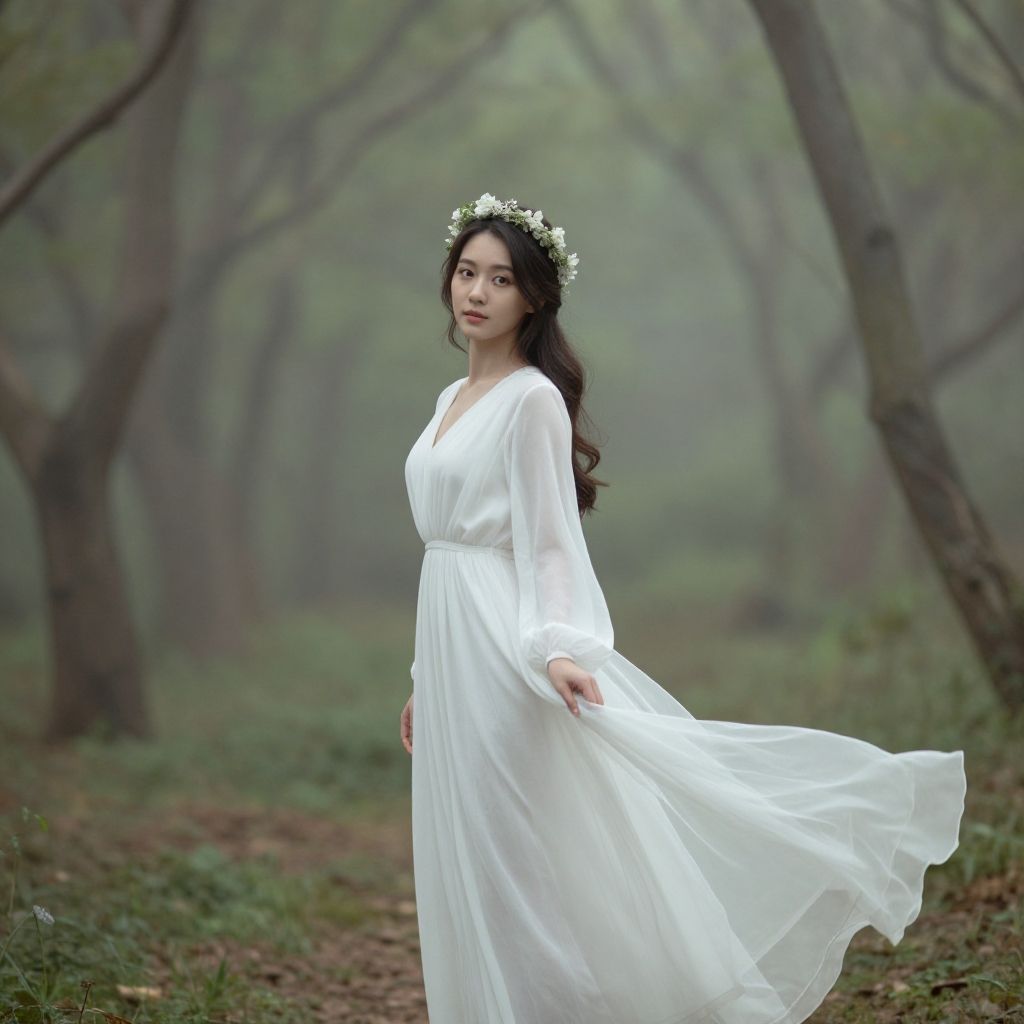 A photograph of an Asian woman with fair skin and black, shoulder-length wavy hair, standing in a sunlit orchard. She wears a white, semi-sheer, V-neck dress with short puffed sleeves and a flowing skirt. She holds the skirt slightly outwards with both hands. The background features blurred trees with green foliage and white blossoms, bathed in soft sunlight. Her expression is serene, and the sunlight creates a bright halo effect around her. The image has a dreamy, ethereal quality with a focus on natural beauty and tranquility.
