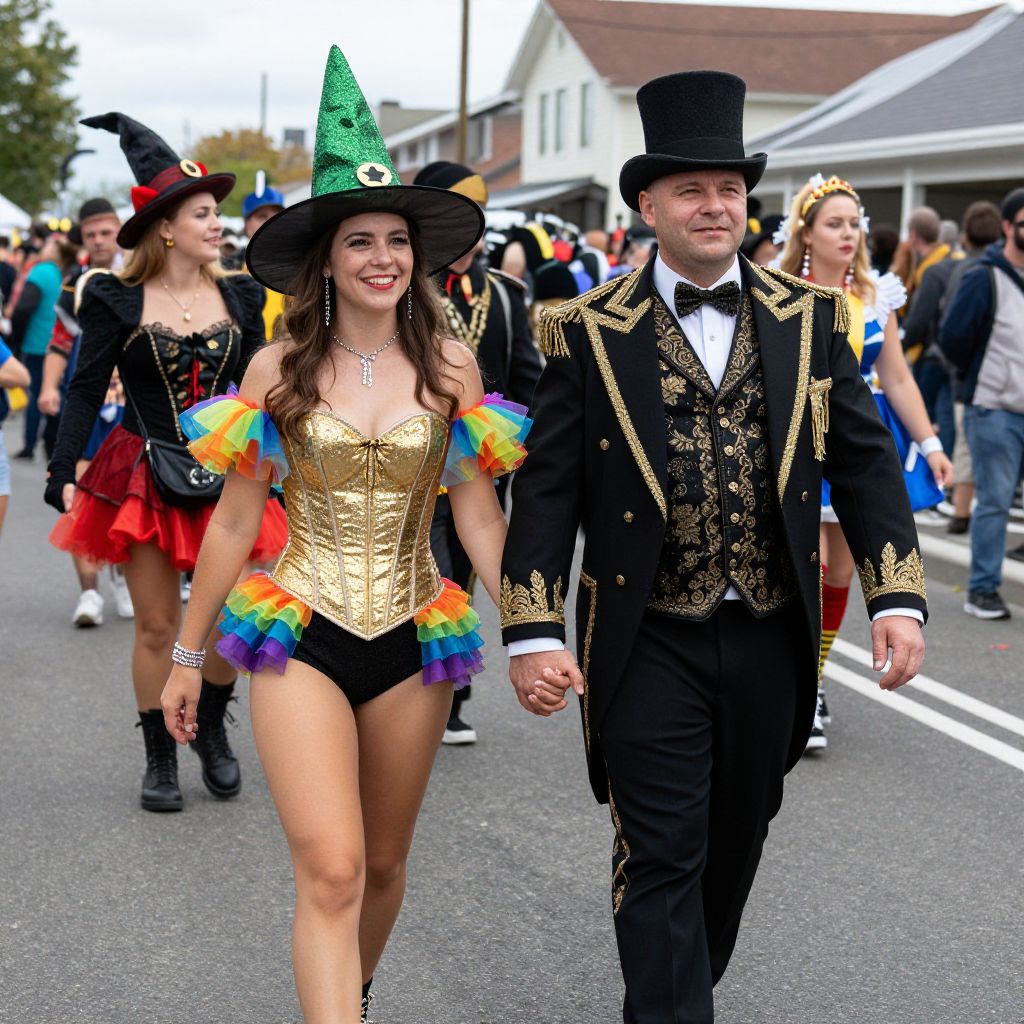 Photograph of a street parade featuring a man and woman walking hand-in-hand. The woman, with medium-length brown hair, wears a green witch hat, gold corset, black shorts, and rainbow-colored, feathered arm cuffs. The man, with short hair, dons a black top hat, black tailcoat with gold trim, black vest, white shirt, and black trousers. In the background, other parade participants, including a woman in a black dress with red tutu and another in blue, are visible. The setting includes buildings with white and brown roofs under a clear sky. The street is lined with spectators.